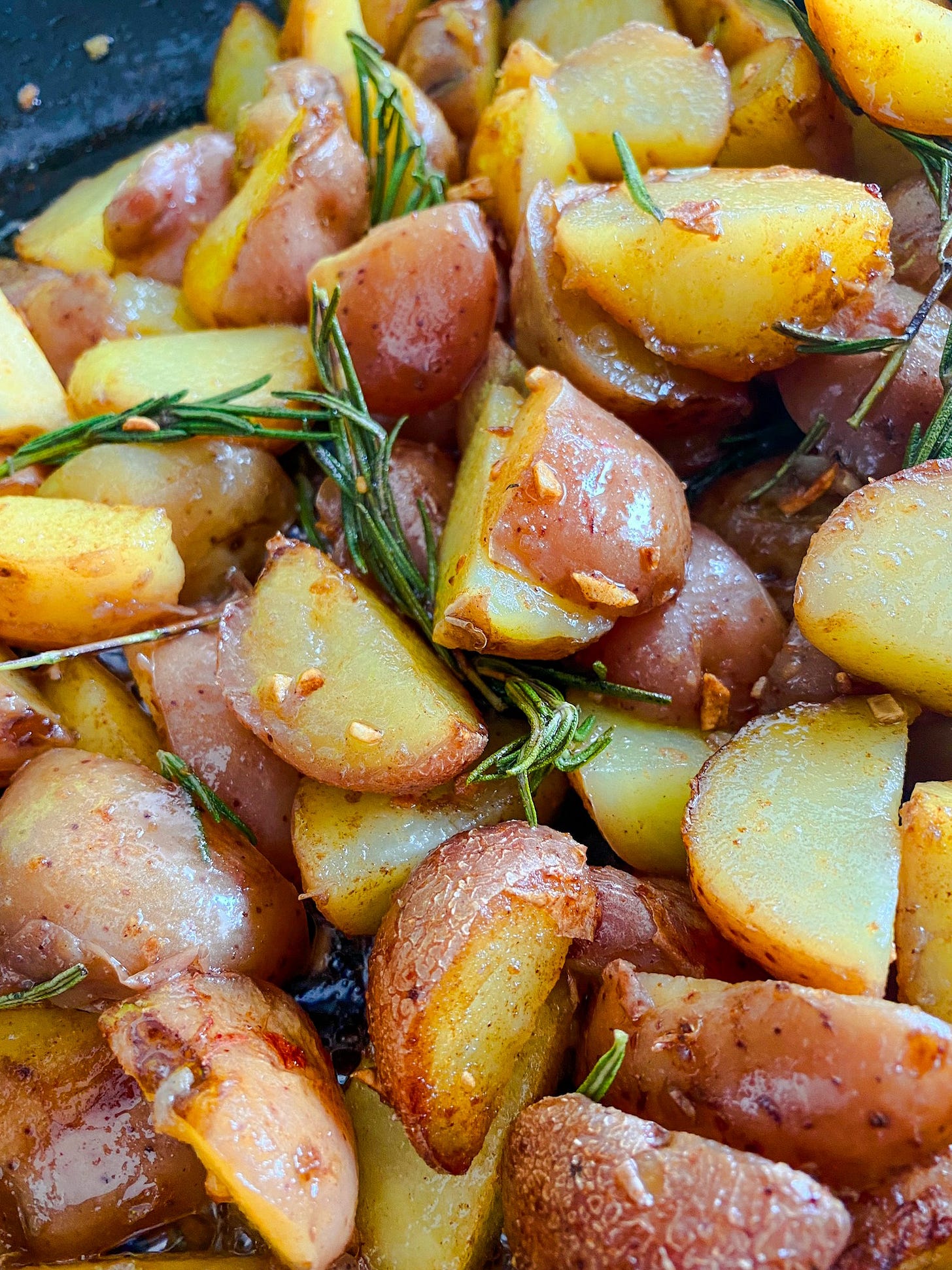potatoes and fish in a cast-iron skillet